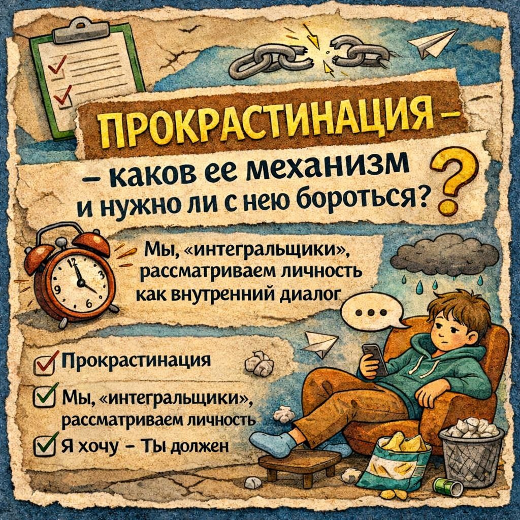 С научной точки зрения, прокрастинация — это внутренний конфликт между желаниями и ощущением долга. Интегральная психология объясняет это через концепцию диалога между разными аспектами «Я» (например, желание отдыхать и необходимость работать). В этой модели выделяют восемь типов таких внутренних диалогов, и прокрастинация относится к пятому, где «Я хочу» сталкивается с «Ты должен».
