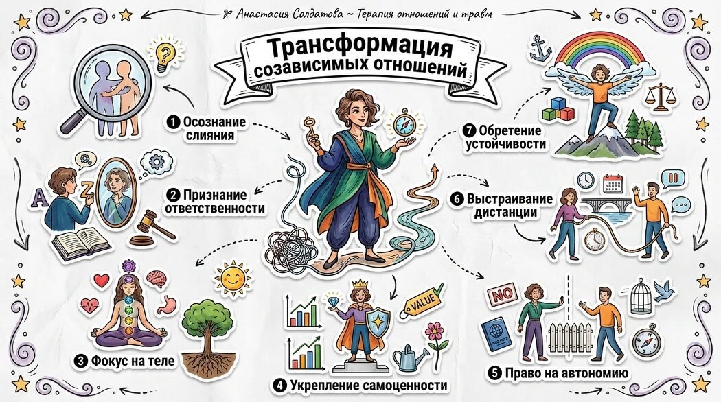 Этот сложный процесс требует как времени, так и смелости, чтобы столкнуться со своими страхами. Работа с профессионалом обеспечит необходимую поддержку и поможет не сбиться с пути во время трудностей. Начать трансформацию можно уже сегодня, чтобы вернуться к себе, независимому от настроения другого человека.