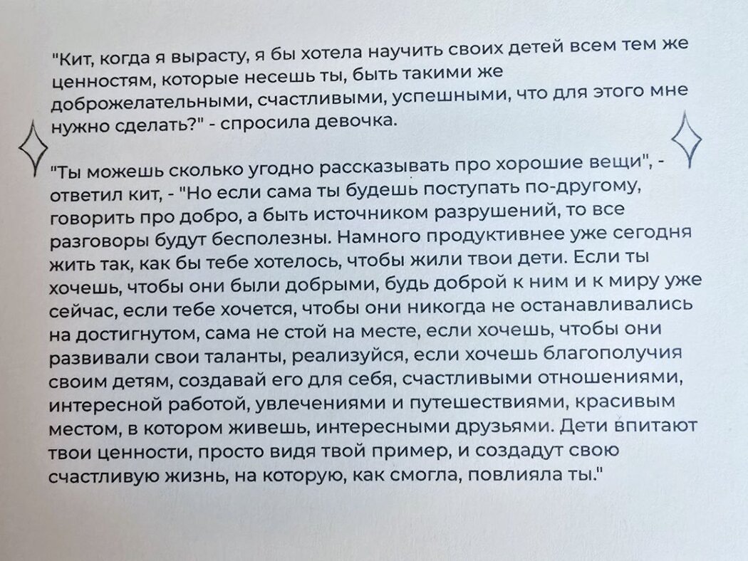 Некоторые знания уже передаются детям на уровне эпигенетики — это те уроки и восприятия, которые они унаследуют от предыдущих поколений. Важно создать пространство для нового опыта, который поможет детям развиваться и находить свое счастье без ожидания, что они обязательно воспользуются этой информацией в будущем. При этом роли авторитетных взрослых невозможно недооценивать — детям действительно нужны наставники. Со временем они сами научатся распорядиться теми знаниями и умениями, которые щедро им предлагают предки.