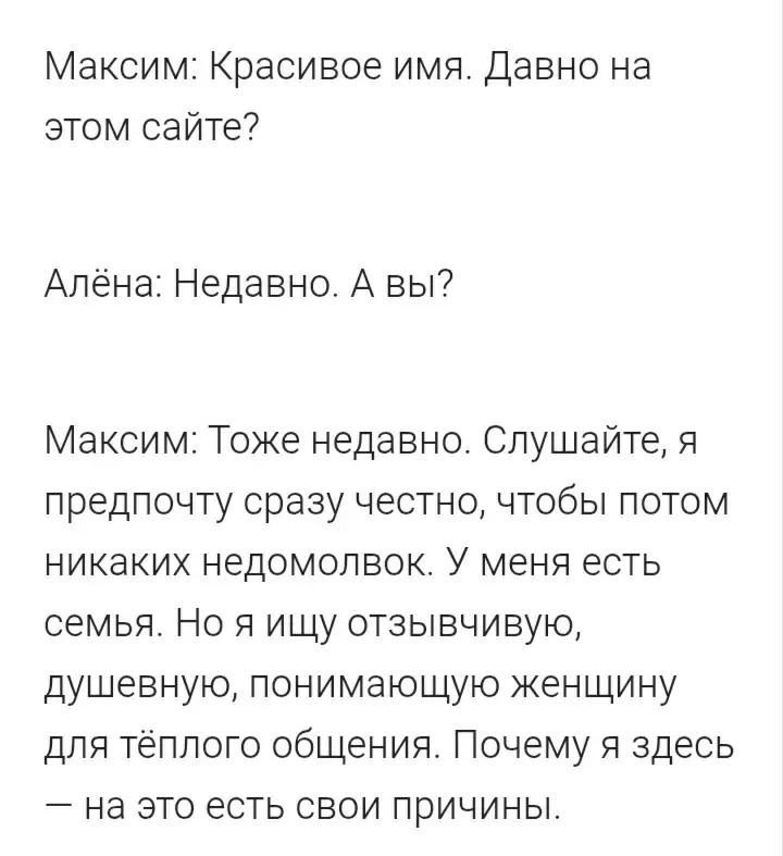 На сайте знакомств мужчина оставляет загадочную фразу: "Я не свободен, ищу отзывчивую и понимающую женщину. А почему я на сайте — на то есть причина". Эта фраза служит своего рода скрытым фильтром, который демонстрирует его намерения.